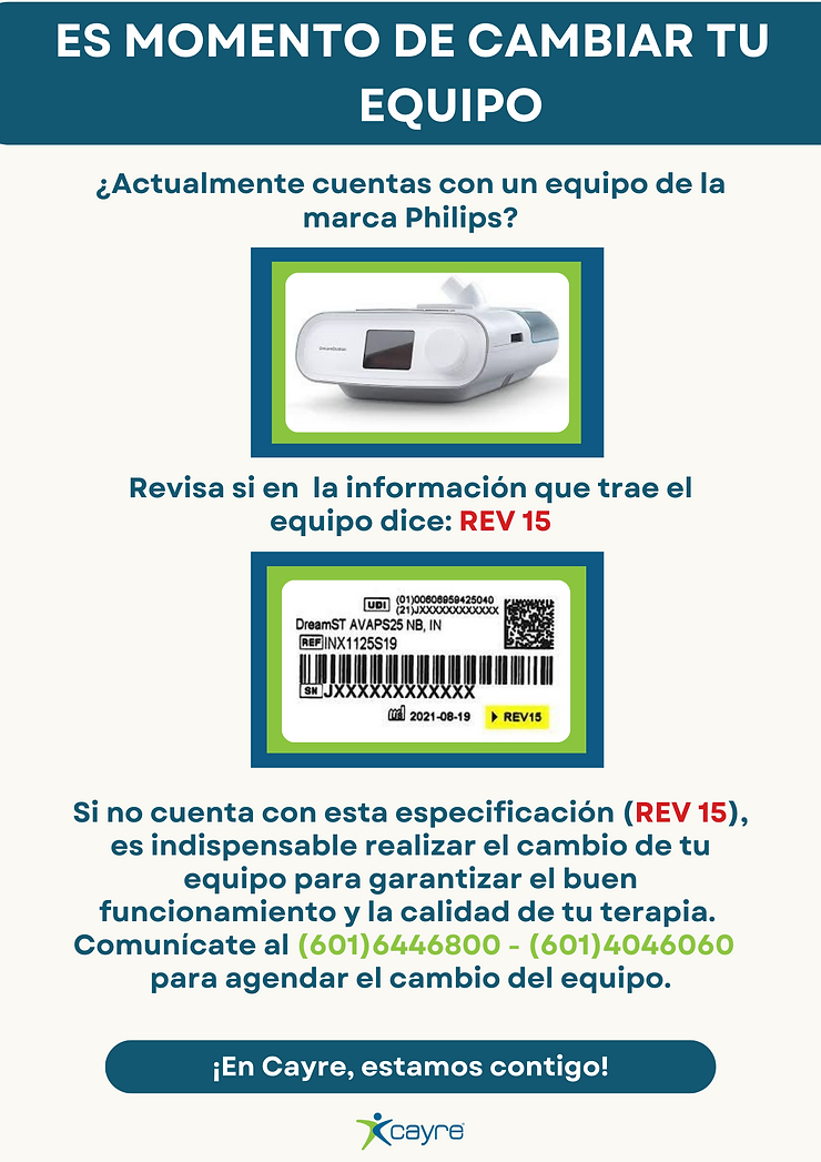 ¿Actualmente cuentas con un equipo de la marca Philips en tu hogar? Si es así, te hacemos una recomendación esencial para garantizar que tu terapia se lleve a cabo con la máxima calidad. Revisa detenidamente la información en tu equipo y busca la especificación «REV 15». Esta pequeña designación es un indicador crucial para el correcto funcionamiento de tu dispositivo. Si tu equipo no cuenta con esta especificación, es indispensable considerar un cambio para asegurarte de que tu terapia sea efectiva y segura.